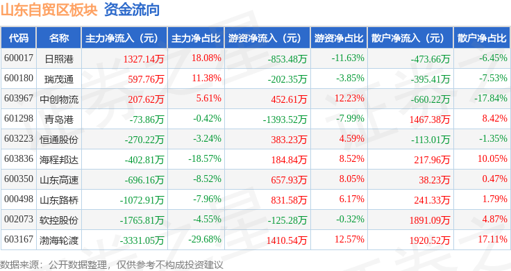 从资金流向上来看,当日山东自贸区板块主力资金净流出5480.3万元,游资资金净流入1346.09万元,散户资金净流入4134.21万元。山东自贸区板块个股资金流向见下表: