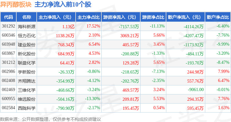 从资金流向上来看,当日异丙醇板块主力资金净流出5947.31万元,游资资金净流出1360.72万元,散户资金净流入7308.03万元。异丙醇板块个股资金流向见下表: