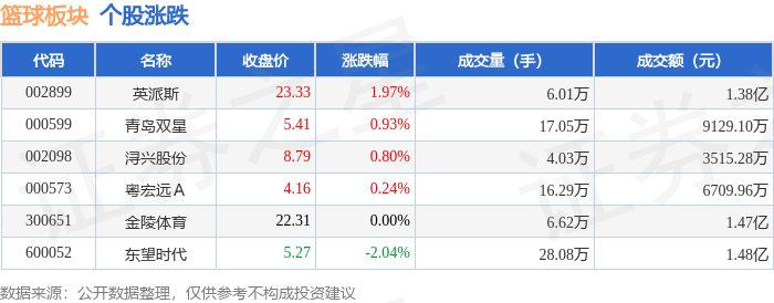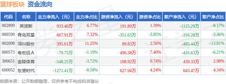从资金流向上来看,当日篮球板块主力资金净流入97.5万元,游资资金净流入1163.33万元,散户资金净流出1260.83万元。篮球板块个股资金流向见下表: