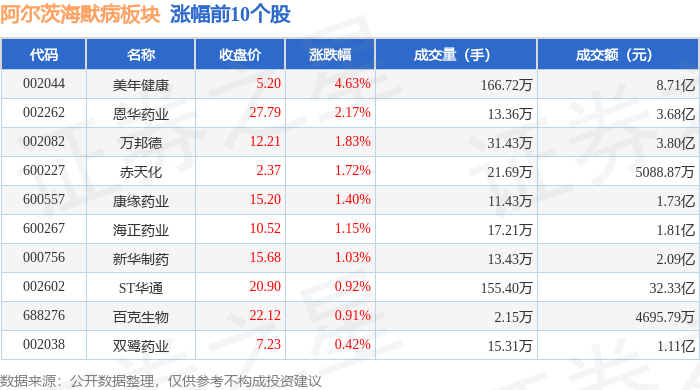 从资金流向上来看,当日阿尔茨海默病板块主力资金净流出3.76亿元,游资资金净流入2.6亿元,散户资金净流入1.17亿元。阿尔茨海默病板块个股资金流向见下表: