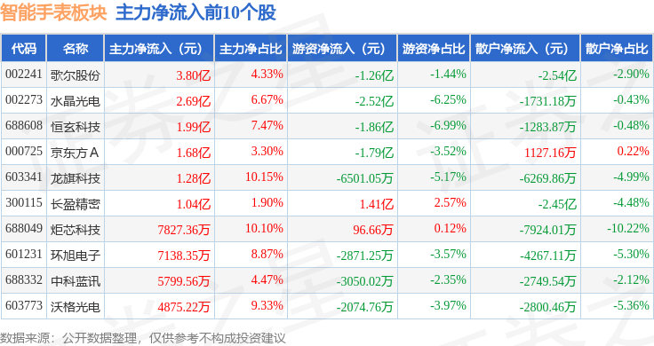 从资金流向上来看,当日智能手表板块主力资金净流入3.94亿元,游资资金净流出4.56亿元,散户资金净流入6281.07万元。智能手表板块个股资金流向见下表:
