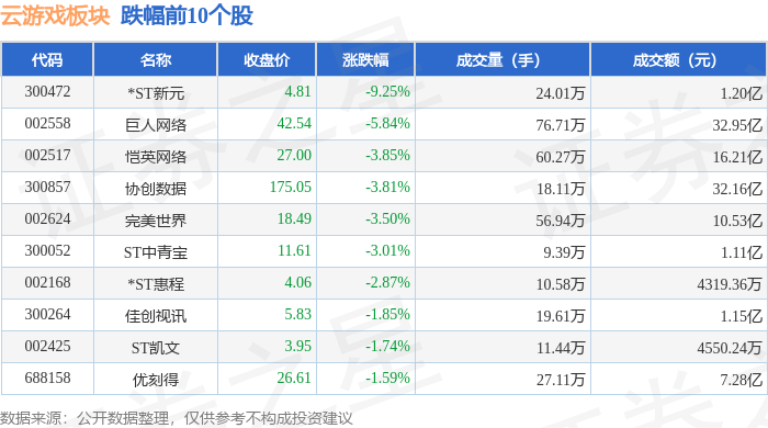 证券之星消息,10月9日云游戏板块较上一交易日下跌0.6%,*ST新元领跌。当日上证指数报收于3933.97,上涨1.32%。深证成指报收于13725.56,上涨1.47%。云游戏板块个股涨跌见下表: