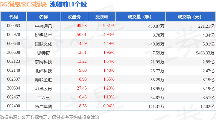 证券之星消息,10月9日5G消息/RCS板块较上一交易日上涨2.98%,中兴通讯领涨。当日上证指数报收于3933.97,上涨1.32%。深证成指报收于13725.56,上涨1.47%。5G消息/RCS板块个股涨跌见下表: