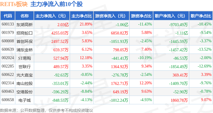 从资金流向上来看,当日REITs板块主力资金净流出5.82亿元,游资资金净流入2.43亿元,散户资金净流入3.4亿元。REITs板块个股资金流向见下表:
