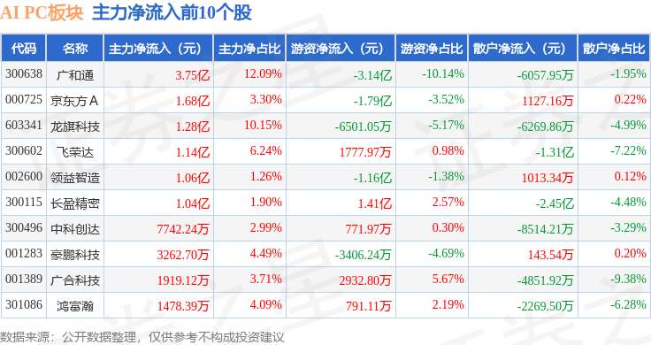从资金流向上来看,当日AI PC板块主力资金净流入5.93亿元,游资资金净流出4.26亿元,散户资金净流出1.67亿元。AI PC板块个股资金流向见下表: