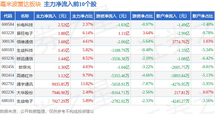 从资金流向上来看,当日毫米波雷达板块主力资金净流入2.96亿元,游资资金净流出1.05亿元,散户资金净流出1.91亿元。毫米波雷达板块个股资金流向见下表: