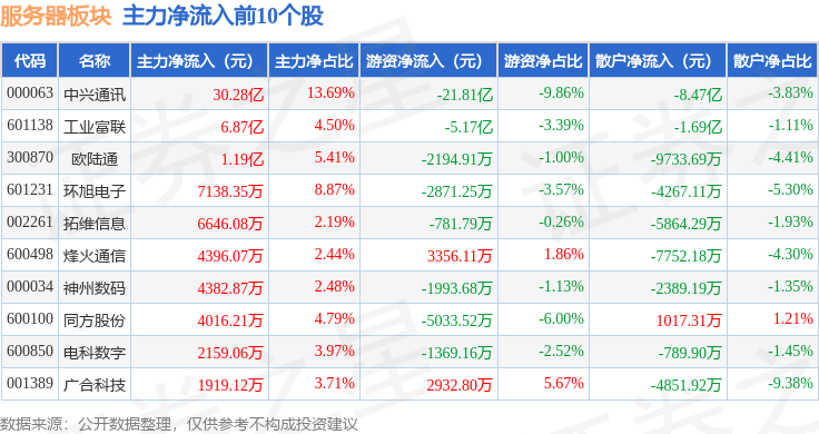 从资金流向上来看,当日服务器板块主力资金净流入21.42亿元,游资资金净流出21.97亿元,散户资金净流入5507.1万元。服务器板块个股资金流向见下表: