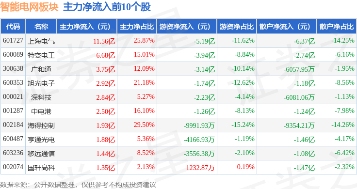 从资金流向上来看,当日智能电网板块主力资金净流入27.36亿元,游资资金净流出19.54亿元,散户资金净流出7.82亿元。智能电网板块个股资金流向见下表: