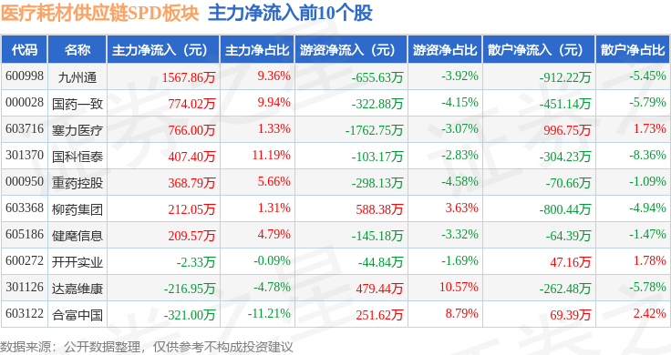 从资金流向上来看,当日医疗耗材供应链SPD板块主力资金净流出1.14亿元,游资资金净流出377.41万元,散户资金净流入1.18亿元。医疗耗材供应链SPD板块个股资金流向见下表: