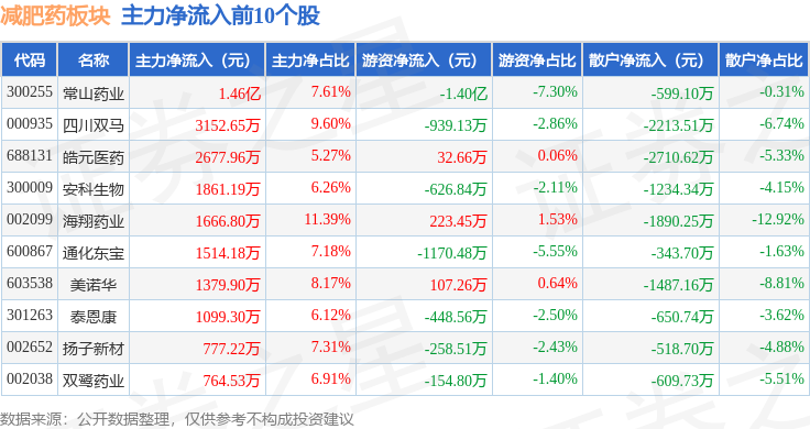 从资金流向上来看,当日减肥药板块主力资金净流出4.41亿元,游资资金净流入1.59亿元,散户资金净流入2.81亿元。减肥药板块个股资金流向见下表:
