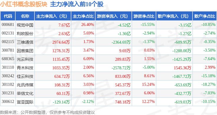 从资金流向上来看,当日小红书概念股板块主力资金净流入6.46亿元,游资资金净流出5.41亿元,散户资金净流出1.05亿元。小红书概念股板块个股资金流向见下表: