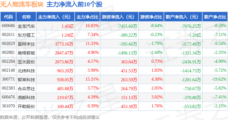 从资金流向上来看,当日无人物流车板块主力资金净流出9263.91万元,游资资金净流入2158.17万元,散户资金净流入7105.75万元。无人物流车板块个股资金流向见下表: