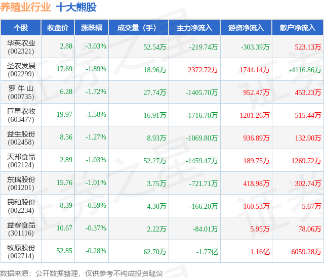 个股表现方面,养殖业行业当日领跌股为华英农业(002321),该股当日报收2.88,下跌3.03%,成交量52.54万,主力资金净流出219.74万元。圣农发展(002299)以下跌1.89%紧随其后,该股当日成交量18.96万,主力资金净流入2372.72万元。除此之外,罗 牛 山(000735)、巨星农牧(603477)、益生股份(002458)均进入当日熊股之列。具体个股列表见下表:
