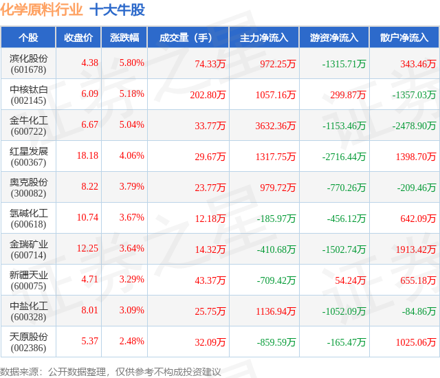 个股表现方面,化学原料行业当日领涨股为滨化股份(601678),该股当日报收4.38,上涨5.8%,成交量74.33万,主力资金净流入972.25万元。中核钛白(002145)以上涨5.18%紧随其后,该股当日成交量202.8万,主力资金净流入1057.16万元。除此之外,金牛化工(600722)、红星发展(600367)、奥克股份(300082)均进入当日牛股之列。具体个股列表见下表: