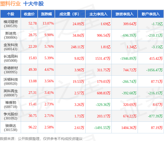 个股表现方面,塑料行业当日领涨股为横河精密(300539),该股当日报收52.78,上涨13.07%,成交量24.09万,主力资金净流入1.69亿元。斯迪克(300806)以上涨9.9%紧随其后,该股当日成交量34.84万,主力资金净流入906.54万元。除此之外,金发科技(600143)、长鸿高科(605008)、奇德新材(300995)均进入当日牛股之列。具体个股列表见下表: