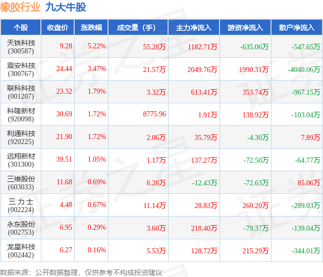 个股表现方面,橡胶行业当日领涨股为天铁科技(300587),该股当日报收9.28,上涨5.22%,成交量55.28万,主力资金净流入1182.71万元。震安科技(300767)以上涨3.47%紧随其后,该股当日成交量21.57万,主力资金净流入2049.76万元。除此之外,联科科技(001207)、科隆新材(920098)、利通科技(920225)均进入当日牛股之列。具体个股列表见下表: