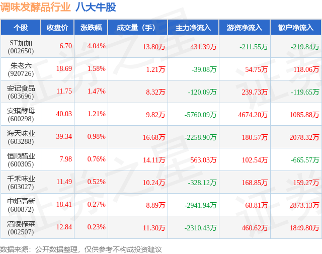 个股表现方面,调味发酵品行业当日领涨股为ST加加(002650),该股当日报收6.7,上涨4.04%,成交量13.8万,主力资金净流入431.39万元。朱老六(920726)以上涨1.58%紧随其后,该股当日成交量1.21万,主力资金净流出39.08万元。除此之外,安记食品(603696)、安琪酵母(600298)、海天味业(603288)均进入当日牛股之列。具体个股列表见下表:
