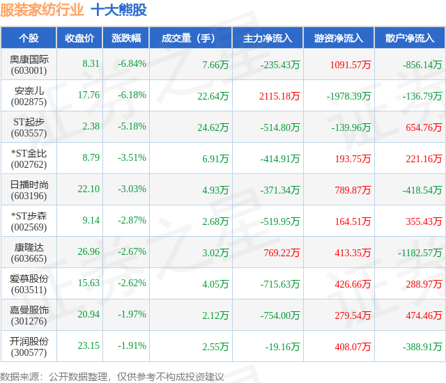 个股表现方面,服装家纺行业当日领跌股为奥康国际(603001),该股当日报收8.31,下跌6.84%,成交量7.66万,主力资金净流出235.43万元。安奈儿(002875)以下跌6.18%紧随其后,该股当日成交量22.64万,主力资金净流入2115.18万元。除此之外,ST起步(603557)、*ST金比(002762)、日播时尚(603196)均进入当日熊股之列。具体个股列表见下表: