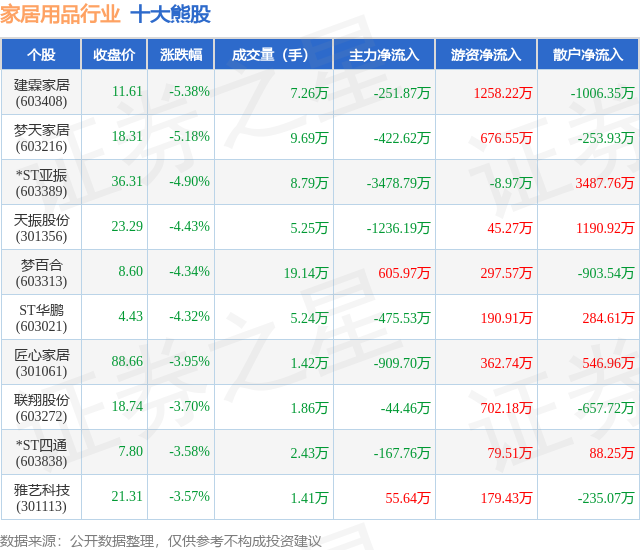 个股表现方面,家居用品行业当日领跌股为建霖家居(603408),该股当日报收11.61,下跌5.38%,成交量7.26万,主力资金净流出251.87万元。梦天家居(603216)以下跌5.18%紧随其后,该股当日成交量9.69万,主力资金净流出422.62万元。除此之外,*ST亚振(603389)、天振股份(301356)、梦百合(603313)均进入当日熊股之列。具体个股列表见下表: