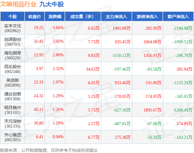 个股表现方面,文娱用品行业当日领涨股为实丰文化(002862),该股当日报收19.25,上涨3.66%,成交量6.65万,主力资金净流入1901.89万元。创源股份(300703)以上涨3.02%紧随其后,该股当日成交量7.73万,主力资金净流入935.45万元。除此之外,海伦钢琴(300329)、高乐股份(002348)、英派斯(002899)均进入当日牛股之列。具体个股列表见下表: