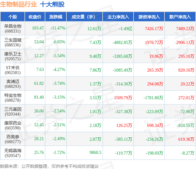 个股表现方面,生物制品行业当日领跌股为荣昌生物(688331),该股当日报收103.47,下跌11.47%,成交量12.61万,主力资金净流出1.49亿元。三生国健(688336)以下跌6.65%紧随其后,该股当日成交量7.43万,主力资金净流出4882.85万元。除此之外,康乐卫士(920575)、ST未名(002581)、奥浦迈(688293)均进入当日熊股之列。具体个股列表见下表: