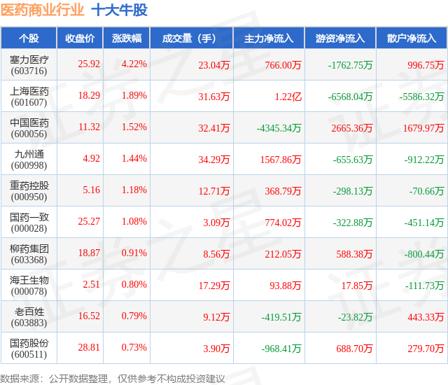 个股表现方面,医药商业行业当日领涨股为塞力医疗(603716),该股当日报收25.92,上涨4.22%,成交量23.04万,主力资金净流入766.0万元。上海医药(601607)以上涨1.89%紧随其后,该股当日成交量31.63万,主力资金净流入1.22亿元。除此之外,中国医药(600056)、九州通(600998)、重药控股(000950)均进入当日牛股之列。具体个股列表见下表: