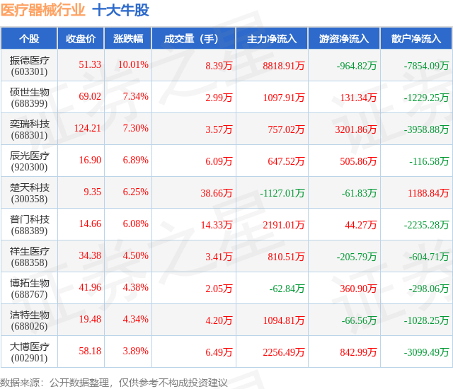 个股表现方面,医疗器械行业当日领涨股为振德医疗(603301),该股当日报收51.33,上涨10.01%,成交量8.39万,主力资金净流入8818.91万元。硕世生物(688399)以上涨7.34%紧随其后,该股当日成交量2.99万,主力资金净流入1097.91万元。除此之外,奕瑞科技(688301)、辰光医疗(920300)、楚天科技(300358)均进入当日牛股之列。具体个股列表见下表: