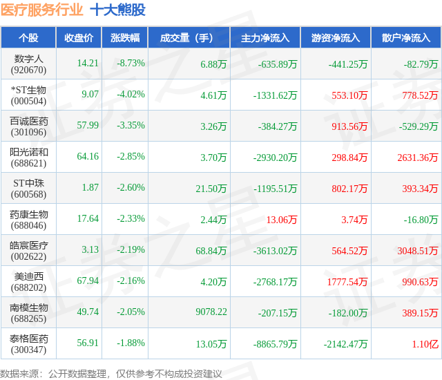 个股表现方面,医疗服务行业当日领跌股为数字人(920670),该股当日报收14.21,下跌8.73%,成交量6.88万,主力资金净流出635.89万元。*ST生物(000504)以下跌4.02%紧随其后,该股当日成交量4.61万,主力资金净流出1331.62万元。除此之外,百诚医药(301096)、阳光诺和(688621)、ST中珠(600568)均进入当日熊股之列。具体个股列表见下表: