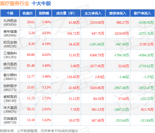 个股表现方面,医疗服务行业当日领涨股为九洲药业(603456),该股当日报收20.61,上涨5.96%,成交量41.88万,主力资金净流入5353.68万元。美年健康(002044)以上涨4.63%紧随其后,该股当日成交量166.72万,主力资金净流入647.76万元。除此之外,和元生物(688238)、三博脑科(301293)、皓元医药(688131)均进入当日牛股之列。具体个股列表见下表:
