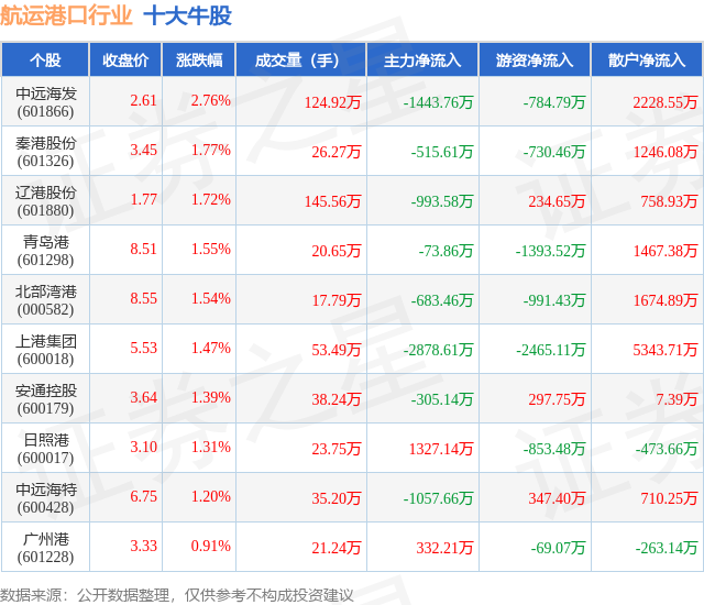 个股表现方面,航运港口行业当日领涨股为中远海发(601866),该股当日报收2.61,上涨2.76%,成交量124.92万,主力资金净流出1443.76万元。秦港股份(601326)以上涨1.77%紧随其后,该股当日成交量26.27万,主力资金净流出515.61万元。除此之外,辽港股份(601880)、青岛港(601298)、北部湾港(000582)均进入当日牛股之列。具体个股列表见下表: