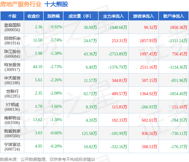 个股表现方面,房地产服务行业当日领跌股为皇庭国际(000056),该股当日报收2.36,下跌9.92%,成交量30.09万,主力资金净流出1940.68万元。招商积余(001914)以下跌5.74%紧随其后,该股当日成交量24.67万,主力资金净流入253.31万元。除此之外,珠江股份(600684)、特发服务(300917)、中天服务(002188)均进入当日熊股之列。具体个股列表见下表: