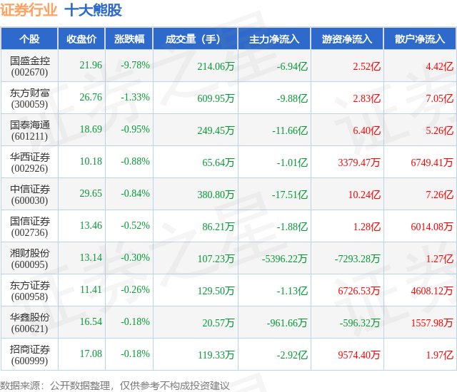 个股表现方面,证券行业当日领跌股为国盛金控(002670),该股当日报收21.96,下跌9.78%,成交量214.06万,主力资金净流出6.94亿元。东方财富(300059)以下跌1.33%紧随其后,该股当日成交量609.95万,主力资金净流出9.88亿元。除此之外,国泰海通(601211)、华西证券(002926)、中信证券(600030)均进入当日熊股之列。具体个股列表见下表: