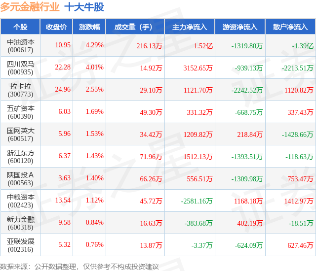 个股表现方面,多元金融行业当日领涨股为中油资本(000617),该股当日报收10.95,上涨4.29%,成交量216.13万,主力资金净流入1.52亿元。四川双马(000935)以上涨4.01%紧随其后,该股当日成交量14.92万,主力资金净流入3152.65万元。除此之外,拉卡拉(300773)、五矿资本(600390)、国网英大(600517)均进入当日牛股之列。具体个股列表见下表: