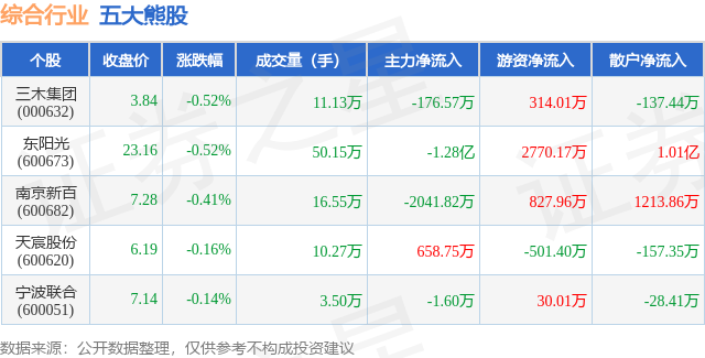 个股表现方面,综合行业当日领跌股为三木集团(000632),该股当日报收3.84,下跌0.52%,成交量11.13万,主力资金净流出176.57万元。东阳光(600673)以下跌0.52%紧随其后,该股当日成交量50.15万,主力资金净流出1.28亿元。除此之外,南京新百(600682)、天宸股份(600620)、宁波联合(600051)均进入当日熊股之列。具体个股列表见下表: