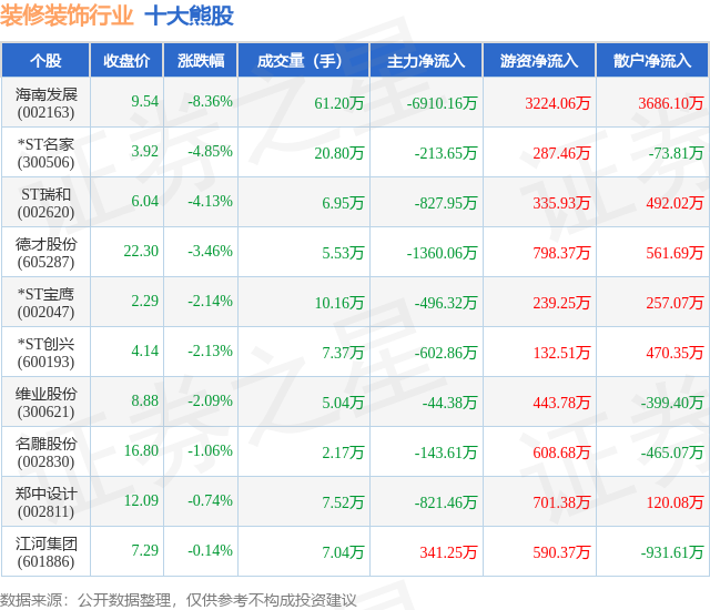 个股表现方面,装修装饰行业当日领跌股为海南发展(002163),该股当日报收9.54,下跌8.36%,成交量61.2万,主力资金净流出6910.16万元。*ST名家(300506)以下跌4.85%紧随其后,该股当日成交量20.8万,主力资金净流出213.65万元。除此之外,ST瑞和(002620)、德才股份(605287)、*ST宝鹰(002047)均进入当日熊股之列。具体个股列表见下表: