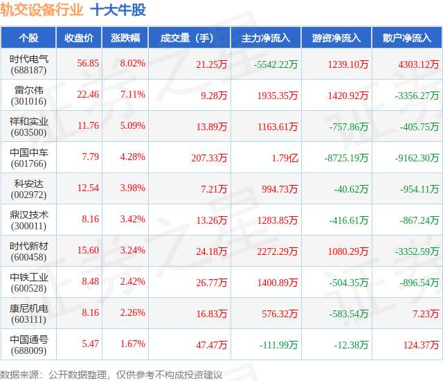 个股表现方面,轨交设备行业当日领涨股为时代电气(688187),该股当日报收56.85,上涨8.02%,成交量21.25万,主力资金净流出5542.22万元。雷尔伟(301016)以上涨7.11%紧随其后,该股当日成交量9.28万,主力资金净流入1935.35万元。除此之外,祥和实业(603500)、中国中车(601766)、科安达(002972)均进入当日牛股之列。具体个股列表见下表: