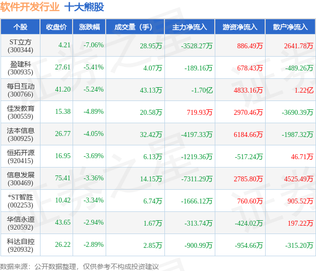 个股表现方面,软件开发行业当日领跌股为ST立方(300344),该股当日报收4.21,下跌7.06%,成交量28.95万,主力资金净流出3528.27万元。盈建科(300935)以下跌5.41%紧随其后,该股当日成交量4.07万,主力资金净流出189.16万元。除此之外,每日互动(300766)、佳发教育(300559)、法本信息(300925)均进入当日熊股之列。具体个股列表见下表: