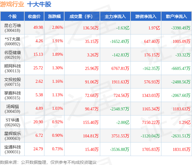 个股表现方面,游戏行业当日领涨股为昆仑万维(300418),该股当日报收49.98,上涨2.86%,成交量136.56万,主力资金净流出1.63亿元。*ST大晟(600892)以上涨1.91%紧随其后,该股当日成交量35.15万,主力资金净流出1652.49万元。除此之外,名臣健康(002919)、顺网科技(300113)、文投控股(600715)均进入当日牛股之列。具体个股列表见下表: