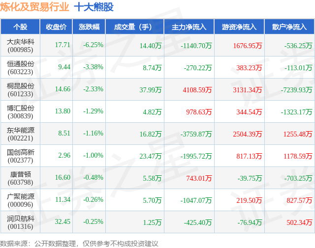 个股表现方面,炼化及贸易行业当日领跌股为大庆华科(000985),该股当日报收17.71,下跌6.25%,成交量14.4万,主力资金净流出1140.7万元。恒通股份(603223)以下跌3.38%紧随其后,该股当日成交量8.74万,主力资金净流出270.22万元。除此之外,桐昆股份(601233)、博汇股份(300839)、东华能源(002221)均进入当日熊股之列。具体个股列表见下表: