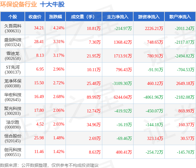 个股表现方面,环保设备行业当日领涨股为久吾高科(300631),该股当日报收34.21,上涨4.24%,成交量10.81万,主力资金净流出214.97万元。盛剑科技(603324)以上涨3.31%紧随其后,该股当日成交量7.3万,主力资金净流入1368.42万元。除此之外,雪迪龙(002658)、ST先河(300137)、龙净环保(600388)均进入当日牛股之列。具体个股列表见下表: