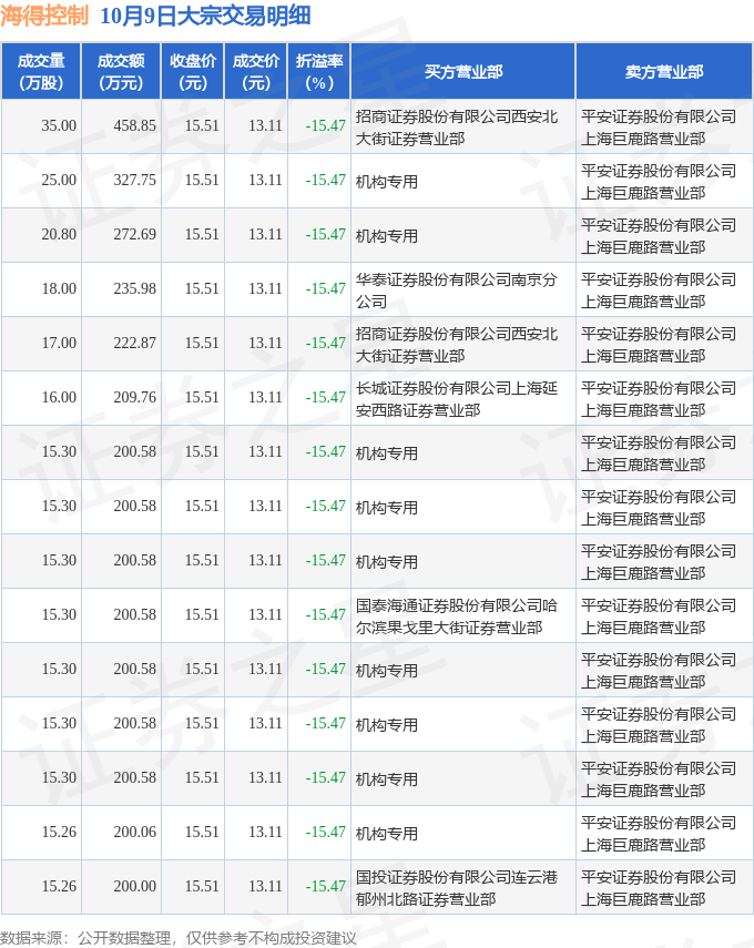 证券之星消息,10月9日海得控制发生大宗交易,交易数据如下: