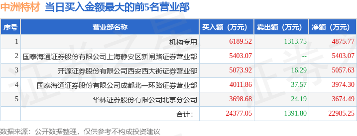 证券之星消息,沪深交易所2025年10月9日公布的交易公开信息显示,中洲特材(300963)因日涨幅达到15%的前5只证券登上龙虎榜。此次是近5个交易日内第1次上榜。