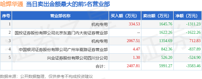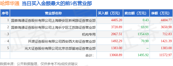 证券之星消息,沪深交易所2025年10月9日公布的交易公开信息显示,哈焊华通(301137)因日涨幅达到15%的前5只证券登上龙虎榜。此次是近5个交易日内第2次上榜。