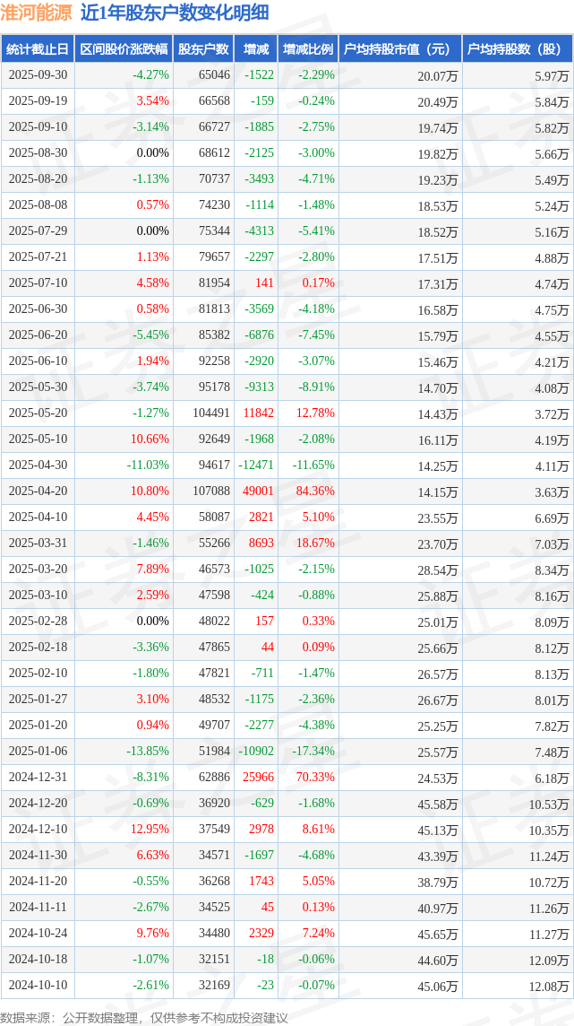 从股价来看,2025年9月19日至2025年9月30日,淮河能源区间跌幅为4.27%,在此期间股东户数减少1522.0户,减幅为2.29%。