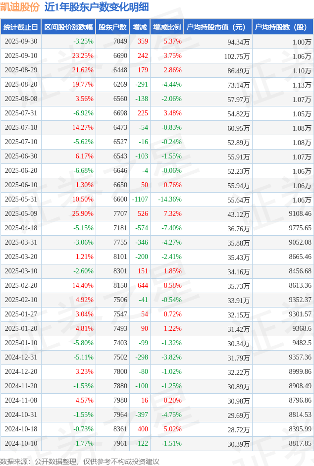 证券之星消息,近日凯迪股份披露,截至2025年9月30日公司股东户数为7049.0户,较9月10日增加359.0户,增幅为5.37%。户均持股数量由上期的1.06万股减少至1.0万股,户均持股市值为94.34万元。