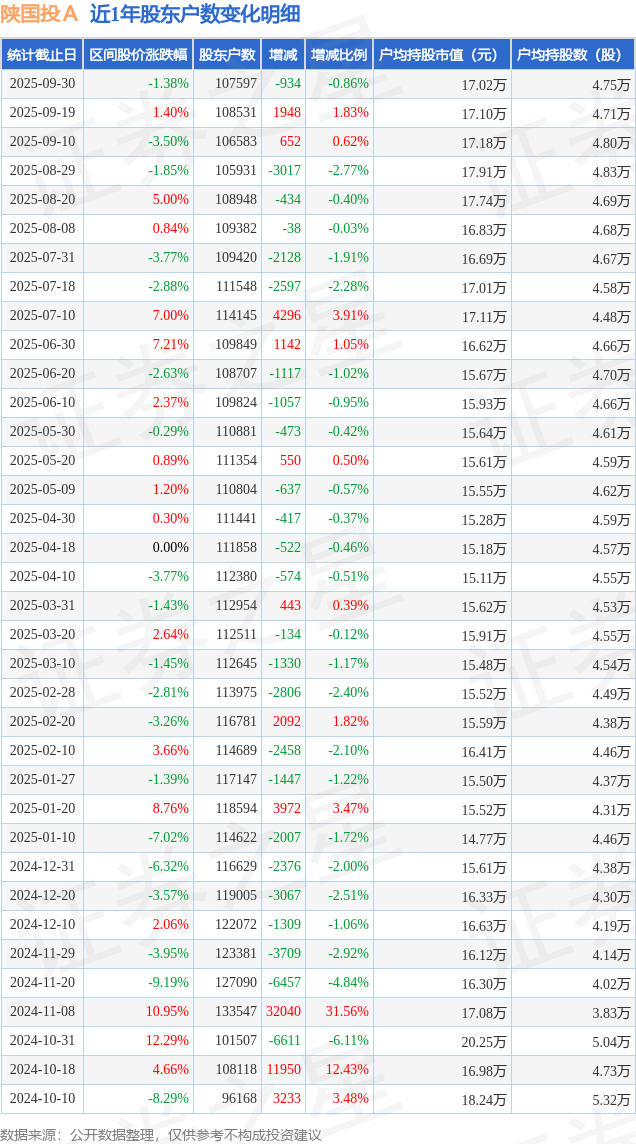 从股价来看,2025年9月19日至2025年9月30日,陕国投A区间跌幅为1.38%,在此期间股东户数减少934.0户,减幅为0.86%。