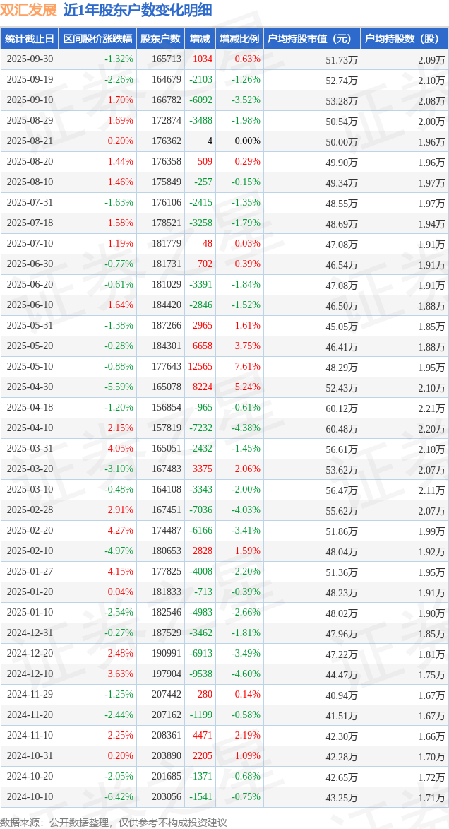 从股价来看,2025年9月20日至2025年9月30日,双汇发展区间跌幅为1.32%,在此期间股东户数增加1034.0户,增幅为0.63%。