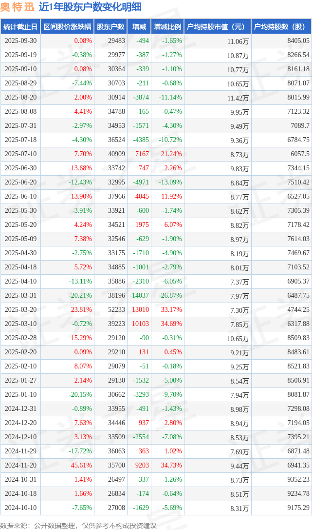 从股价来看,2025年9月19日至2025年9月30日,奥 特 迅区间涨幅为0.08%,在此期间股东户数减少494.0户,减幅为1.65%。