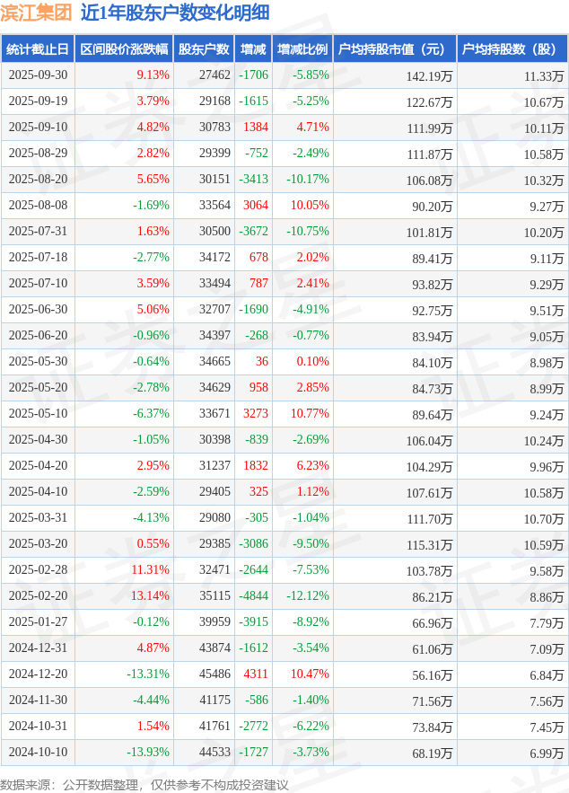 从股价来看,2025年9月20日至2025年9月30日,滨江集团区间涨幅为9.13%,在此期间股东户数减少1706.0户,减幅为5.85%。