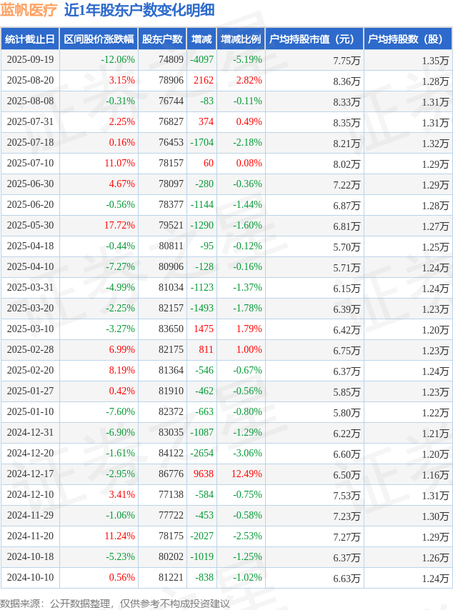 从股价来看,2025年8月20日至2025年9月19日,蓝帆医疗区间跌幅为12.06%,在此期间股东户数减少4097.0户,减幅为5.19%。